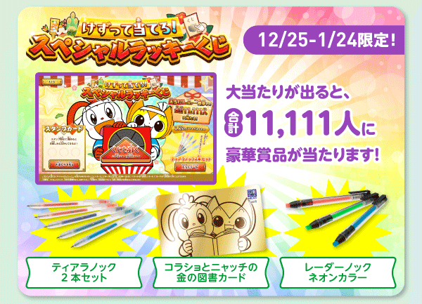※「けずって当てろ!スペシャルラッキーくじ」は12/29~1/4、1/9~11、1/16~18は1日1回、12/25~12/28、1/19~24は1日2回、1/5~8、1/12~15は1日3回までひくことができます。