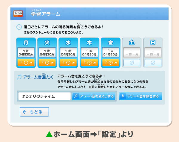 連休中の学習リズムの乱れを防ぐために、連休前に「学習アラーム」の設定時刻を見直してみましょう。