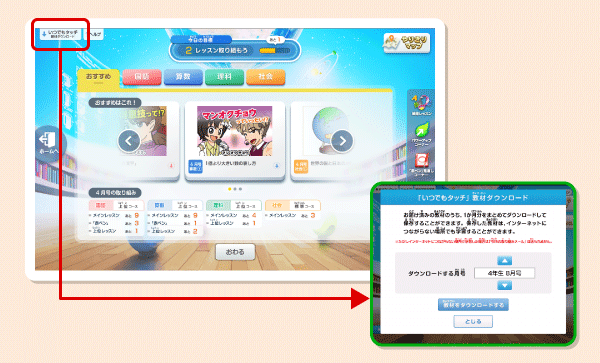 「教室」画面左上の「いつでもタッチ 教材ダウンロード」をタップしてください。