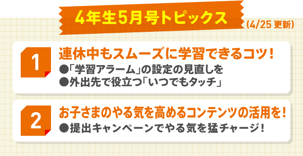 連休中は、学習リズムが普段とは異なります。「いつ『チャレンジタッチ』に取り組む?」と、お子さまと相談するのもおすすめです。