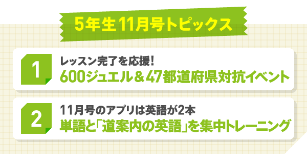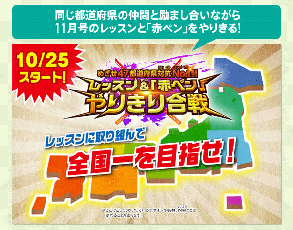 11月号では、お子さまが学習リズムを取り戻すための楽しい企画をご用意。そのひとつが「めざせ47都道府県対抗No.1!! レッスン&『赤ペン』やりきり合戦」です。全国の仲間と共に励まし合ったり競い合ったりしながら、楽しく勉強に向かえるように、難しくなる学習のつまずきを解消し、楽しく力をつけていけるように、という願いを込めています。