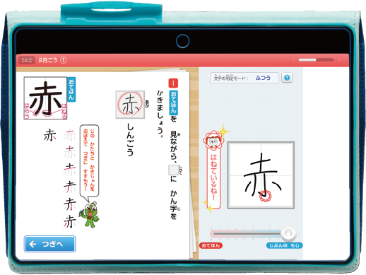 書き順、字形、とめ・はねまで、細かな自動採点で、正しく書く習慣が身につく。