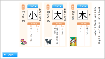 「メインレッスン」では、初めて漢字を習う1年生が身につけるべき観点を、楽しく確実に定着させることができます。アプリでは、漢字をイメージ・意味とセットで覚えることで漢字の習得に役立ちます。