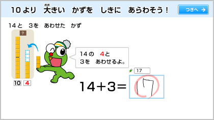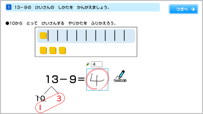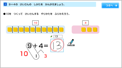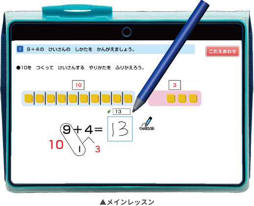 自分でブロックを動かして、意味や考え方を理解。実際に数字や式を書いて、計算のしかたを確認しながら、演習に取り組みます。